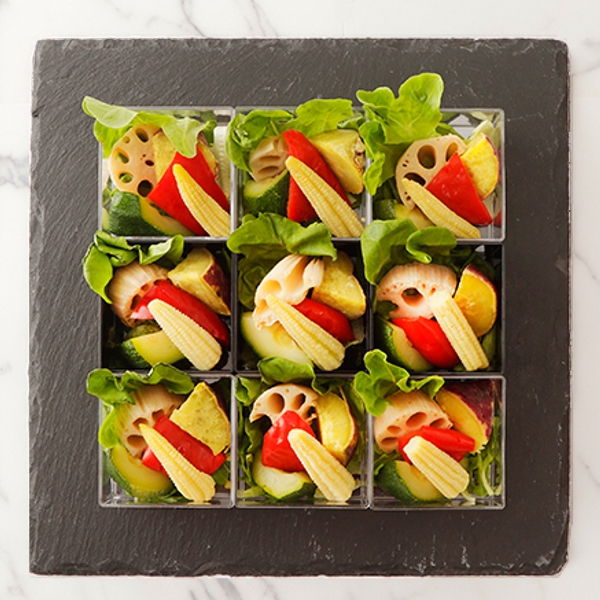 【食材、ポーション】 [L]9カップ トレビス・ブロッコリー・カリフラワー・2種パプリカ・2種プチトマト各1個(赤・黄)・オクラ・紫玉ねぎ・バーニャソース