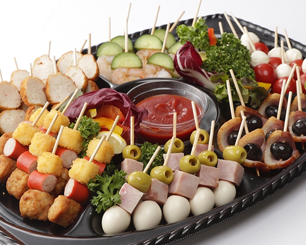 【食材、ポーション】 [M] 6種類、各3本、全18本 [L] 6種類、各4本、全24本 [LL] 6種類、各7本、全42本 ミニトマトとモッツァレラのカプレーゼ、カニすり身のフリット、エビとキュウリのチリマヨソース、カリカリチーズと鶏と一口ウインナー、ハムとうずらとグリーンオリーブ、合鴨ローストとブラックオリーブ ※写真はLLサイズです。 ※写真はイメージです。 ※仕入状況により内容を一部変更する可能性がございます。