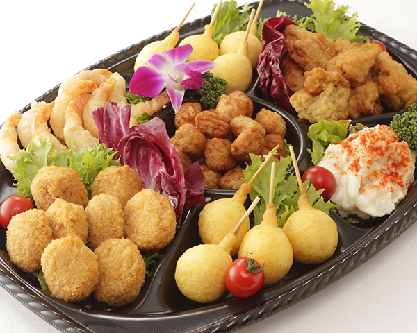 【食材・ポーション】 [M] 60g [L]80g [LL]120g ポテトサラダ [M] 3個 [L]4個 [LL]6個 フライドチキン [M] 3個 [L]4個 [LL]6個 ライスコロッケ [M] 6個 [L]8個 [LL]12個 ミートボール [M] 3個 [L]4個 [LL]6個 海老フリッター [M] 3個 [L]4個 [LL]6個 チーズドック 【容器サイズ】 M:縦30cm×横30cmプレート L:縦39cm×横28cmプレート LL:縦44cm×横32cmプレート ※写真はLLサイズです。 ※写真はイメージです。 ※仕入状況により内容を一部変更する可能性がございます。